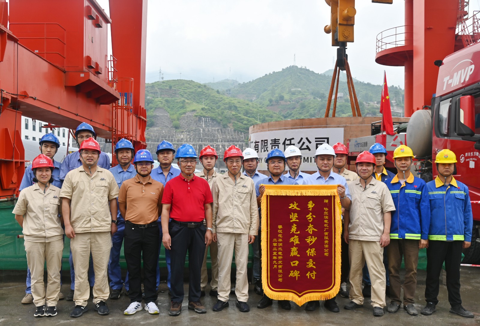 26日上午,現(xiàn)場各單位立即投入到吊裝前的準(zhǔn)備工作中。攀水電公司全程跟進(jìn)機(jī)電安裝進(jìn)展,逐一確認(rèn)安裝條件;施工單位技術(shù)人員按吊裝方案全面落實(shí)安全交底與技術(shù)措施,確保萬無一失;在各項(xiàng)準(zhǔn)備工作全面就緒的基礎(chǔ)上,6號(hào)機(jī)組的轉(zhuǎn)子支架平穩(wěn)、精準(zhǔn)吊裝就位。川投能源副總經(jīng)理、攀水電公司黨總支書記、董事長徐孝剛現(xiàn)場督導(dǎo)吊裝工作,充分肯定了哈電公司在本次極端條件下的運(yùn)輸成績,并向哈爾濱電機(jī)廠有限責(zé)任公司授予錦旗,感謝其長期以來對(duì)銀江水電站建設(shè)的大力支持。