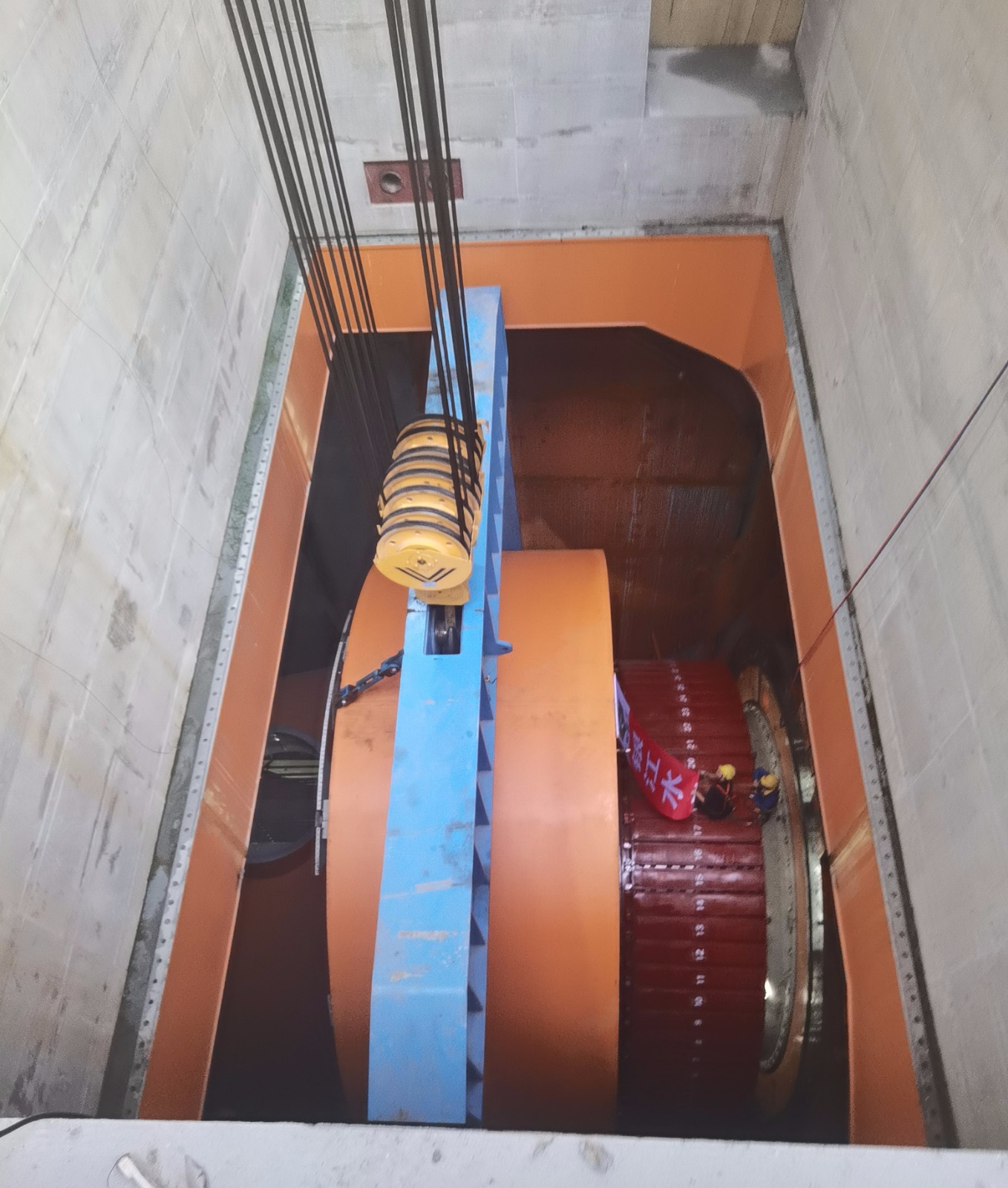 轉(zhuǎn)子與定子均是水輪發(fā)電機(jī)組核心部件,其裝配精度要求極高,本次吊裝過(guò)程堪稱機(jī)組安裝中技術(shù)最復(fù)雜、風(fēng)險(xiǎn)最高的環(huán)節(jié)之一;轉(zhuǎn)子總重約230.5噸,最大安裝直徑達(dá)8473.2毫米,由轉(zhuǎn)子支架、磁極、制動(dòng)環(huán)及轉(zhuǎn)子引線等部件精密組裝而成;定子裝配則包括機(jī)座、內(nèi)支撐、鐵芯、線棒等,總重190.5噸,機(jī)座最大外徑達(dá)10400毫米,總起吊重量高達(dá)約228噸;為確保這兩個(gè)大件的吊裝工作萬(wàn)無(wú)一失,攀水電公司協(xié)同參建各方提前周密部署,對(duì)橋機(jī)制動(dòng)系統(tǒng)、吊具及轉(zhuǎn)子、定子本體狀態(tài)開展全維度細(xì)致檢查,同步落實(shí)現(xiàn)場(chǎng)安全技術(shù)交底,完成起吊設(shè)備調(diào)試、操作流程演練等準(zhǔn)備工作,夯實(shí)安全基礎(chǔ)。